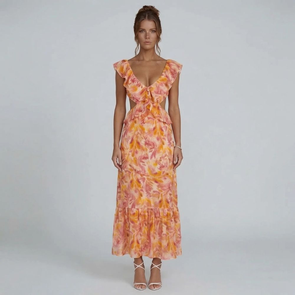 Introducing the Lorena Ruffle Maxi Dress — a breezy and romantic silhouette with vibrant watercolor hues and effortless charm.