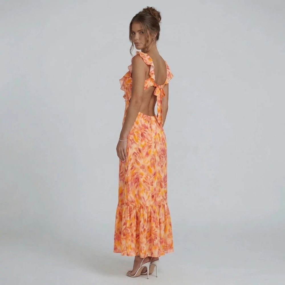 This maxi dress defines casual elegance with its playful tiered hem and stunning open-back design. The bold ruffle neckline frames you beautifully, while delicate back ties and side cutouts add a modern twist to its feminine vibe. Whether it’s a garden party, vacation strolls, or brunch plans, this dress floats with you, bringing color and movement to every step.