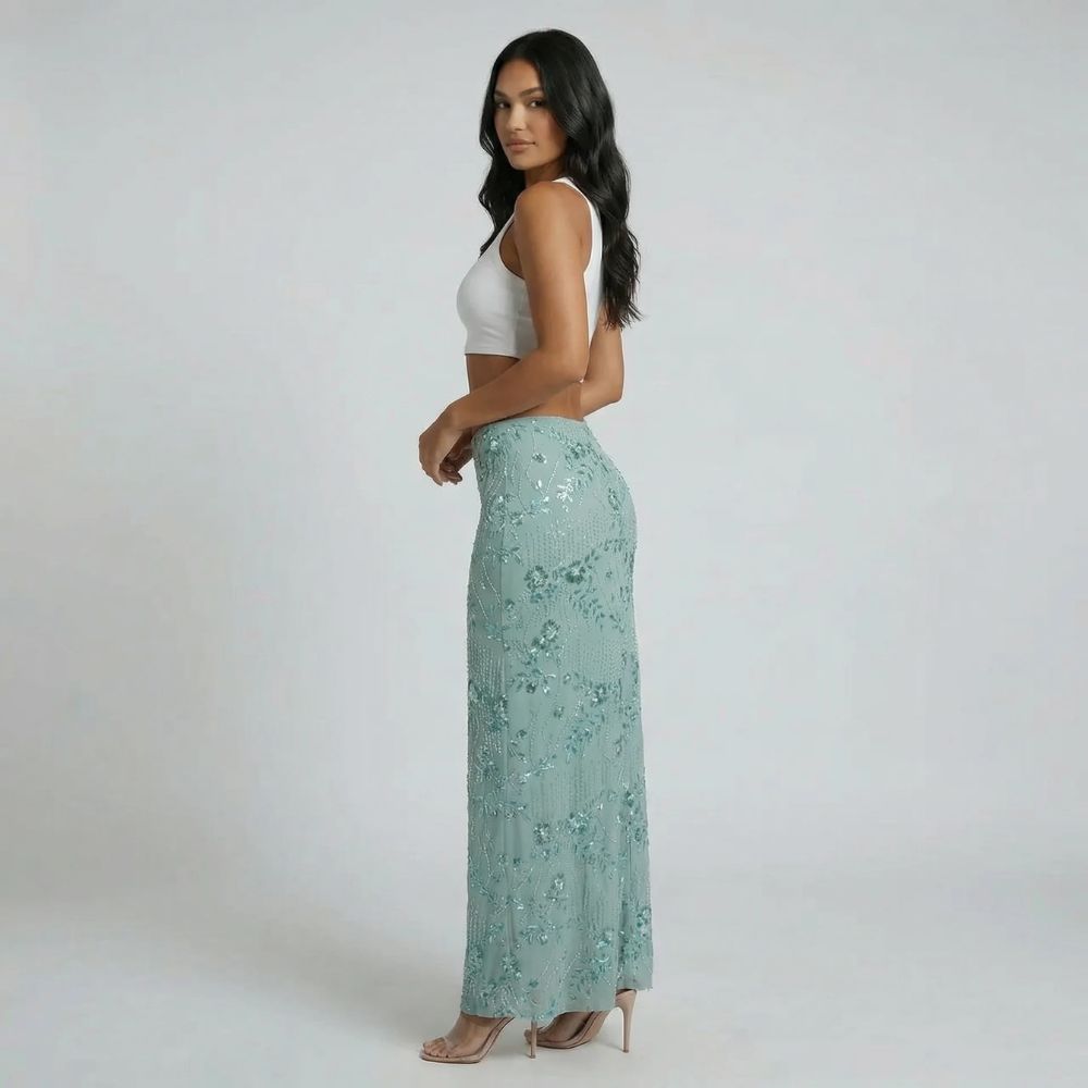 Bring after-dark sparkle to your look with a low-rise maxi skirt that drapes in a sleek column shape and catches the light with every step. The all-over beaded sequin floral design makes it an elevated choice for parties, concerts, and nights out.