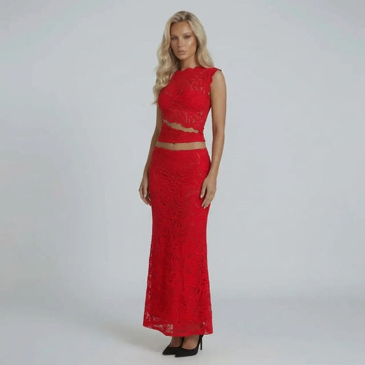This beautiful set features intricate lace patterns throughout, with a cropped sleeveless top and a high-waisted maxi skirt. The form-fitting silhouette gently skims the body, making it a perfect choice for evenings out or elegant date nights where you want to make an impact. The vibrant red color ensures you stand out with sophistication.